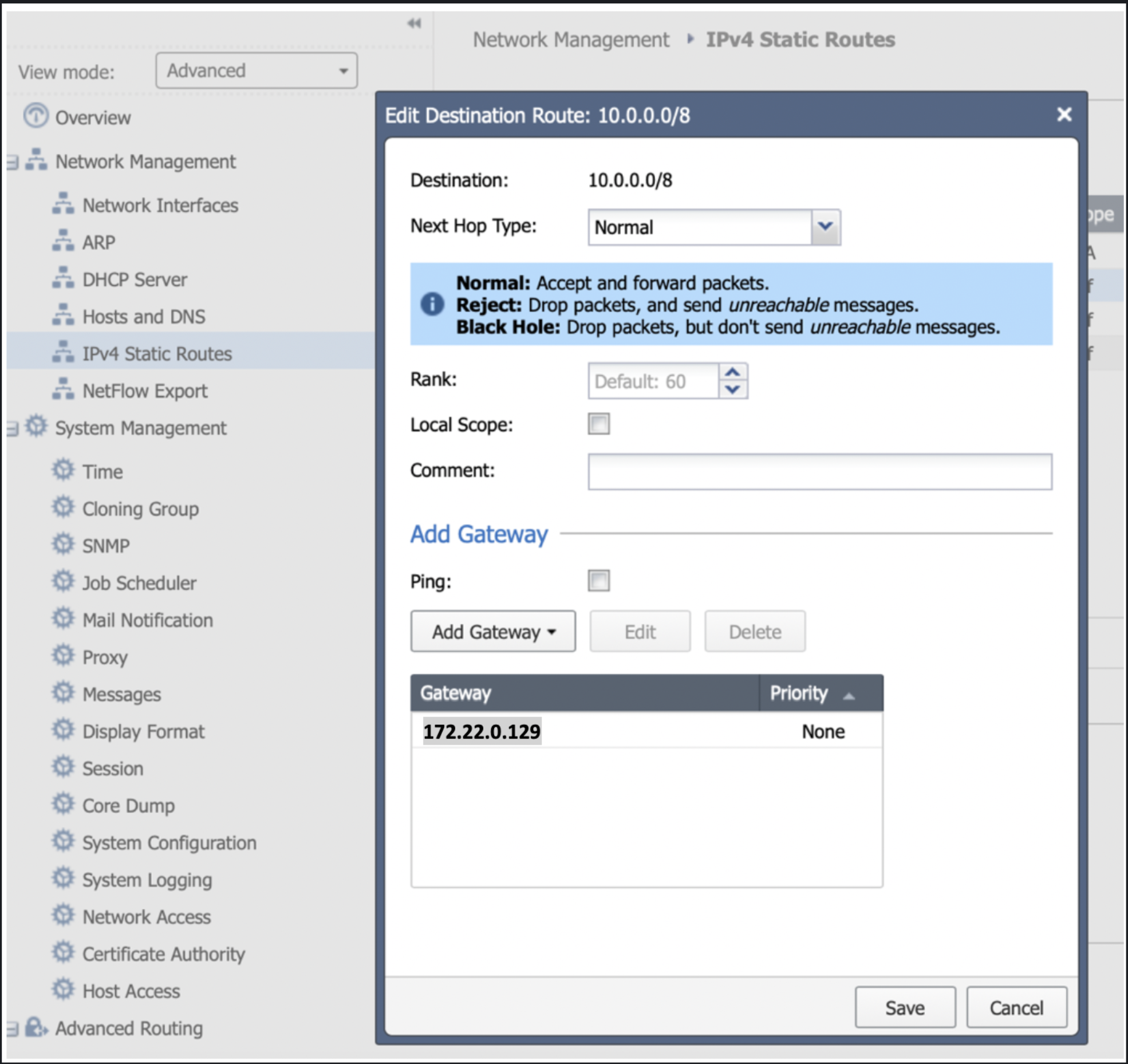 Once you have determined the IP of the next hop, just go to IPv4 Static Routes and click on “Add”. Repeat this step for all three RFC 1918 subnets.